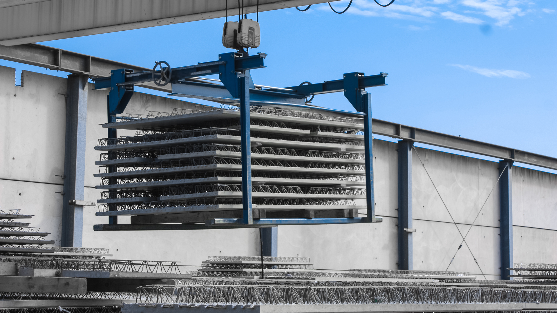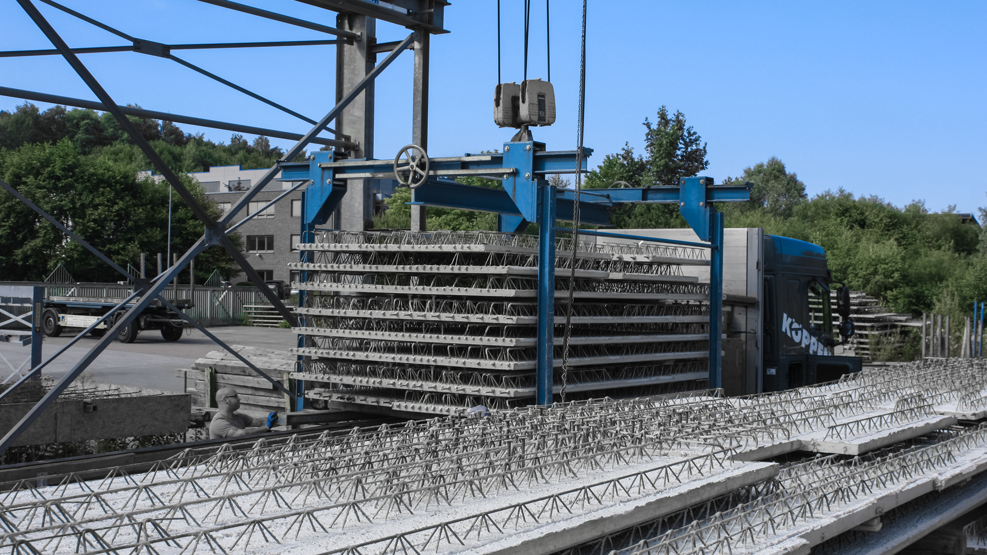 Am vereinbarten Liefertermin können die Elemente mittels Kran direkt verlegt und anschließend - nach Einbau der Systembewehrung - mit Ortbeton bis zur erforderlichen Deckenstärke vergossen werden.